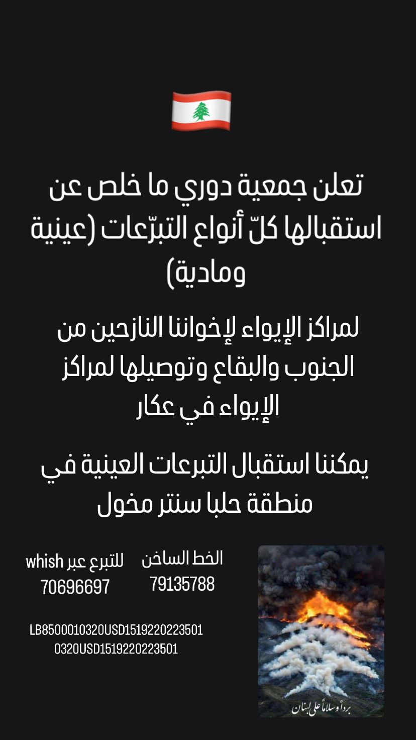 تعلن جمعية دوري ما خلص عن استقبالها كل أنواع التبرعات (عينية ومادية) لمراكز الإيواء لإخواننا النازحين من الجنوب والبقاع وتوصيلها لمراكز الإيواء في عكار.